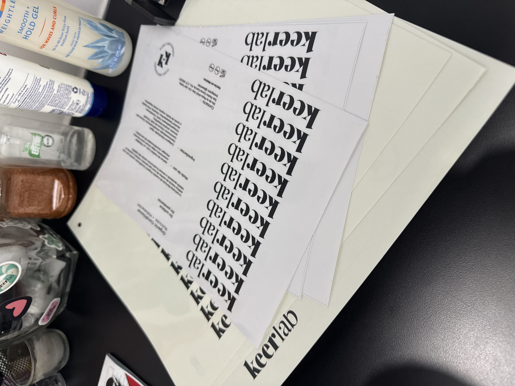 desk or table surface with various items scattered on it. On the left side of the image, there are several bottles and jars, including hair gel, hand sanitizer, and other unidentified containers. To the right, a stack of white papers is visible. These papers are printed with the word "keerlab" in a repeating vertical pattern. One of the papers includes ingredients and a usage guide in Spanish, along with contact information and an Instagram handle @keerlab. This paper indicates the product is "Hecho en México" and lists a location in San Pedro Garza Garcia, NL, CR 66220. There is no mention of San Bernardino Tlaxcalancingo.