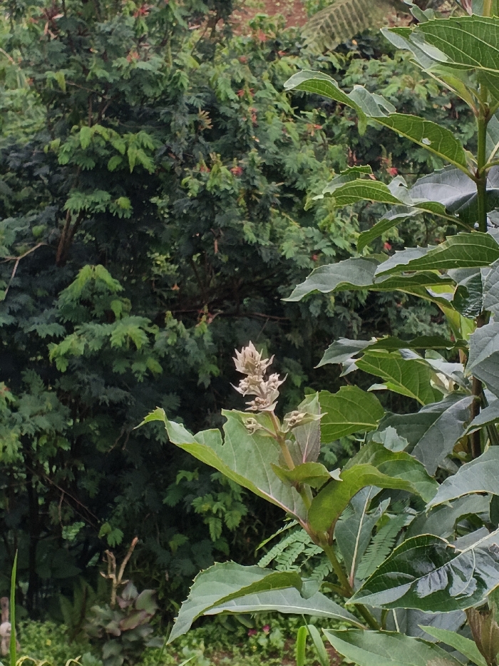 Lush greenery fills the frame. The foreground features a plant with large, jagged-edged green leaves and a developing flower bud at its apex. The midground reveals a dense thicket of leafy trees with tinges of red blossoms. The background blends with the midground, creating a seamless wall of foliage. The scene evokes a sense of natural abundance and tranquility.