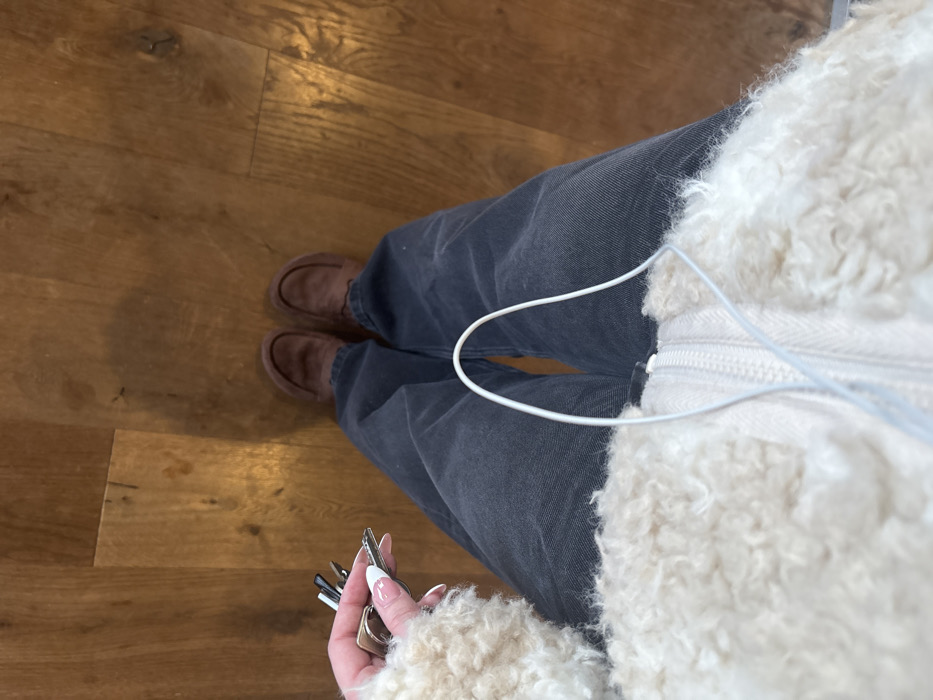 A person wearing dark-wash jeans and brown suede shoes stands on a wood floor. They are wearing a fluffy, white coat with a visible zipper. In their left hand, they hold a set of keys with manicured nails. A white wire, possibly from headphones, is draped across their jeans. The image is taken from a top-down perspective, capturing the person from the waist down.