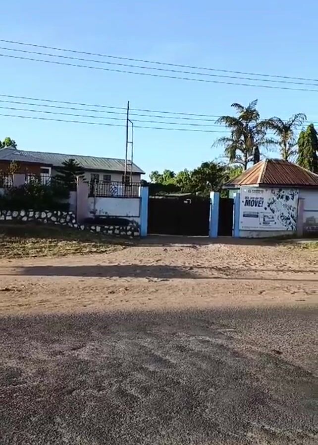 The video pans from a gated compound, across parked cars, to a view of a street in what appears to be a small town or village