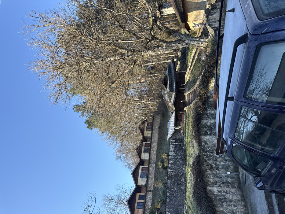 The scene is a tiered hillside in Balgarski Izvor, Bulgaria, observed under a clear blue sky during what appears to be a cold day, indicated by frost