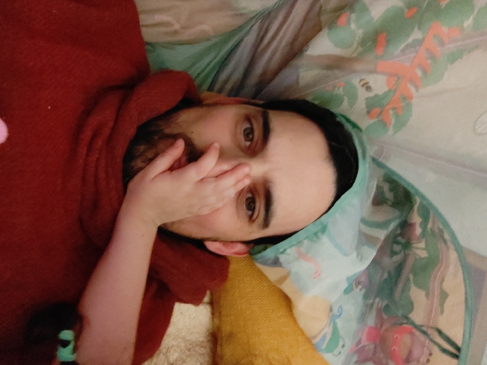 The scene is an indoor domestic environment located in Al Jizah, Jordan. A male adult with dark hair and a short beard is depicted in a supine or reclined position, oriented towards the camera. He wears a dark red, textured turtleneck sweater. A small, pale-skinned hand, presumably belonging to a child, is placed over the man's nose and mouth, partially obscuring these facial features. A green wristband is visible on the wrist associated with this hand. The background directly behind the man's head features a light-colored fabric adorned with a pattern of green leaves and orange shapes. This fabric appears to be part of a child's playmat or activity structure, including a translucent plastic element and a reddish-pink anthropomorphic character toy visible in the upper right portion of the background. Segments of dark grey-green and yellow-ochre fabrics are also present in the immediate surroundings.