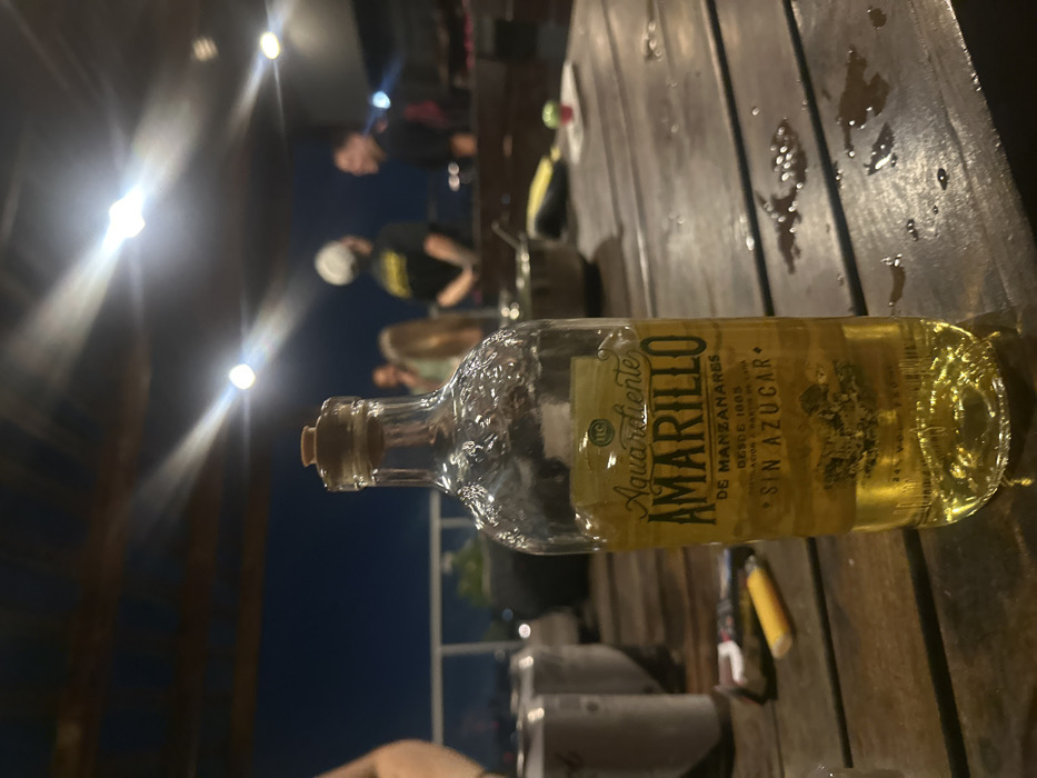 - "A bottle of Aguardiente Amarillo, a clear spirit with a yellow hue, rests horizontally on a wooden table" by FM-Agbk03, licensed under CC BY 4.0