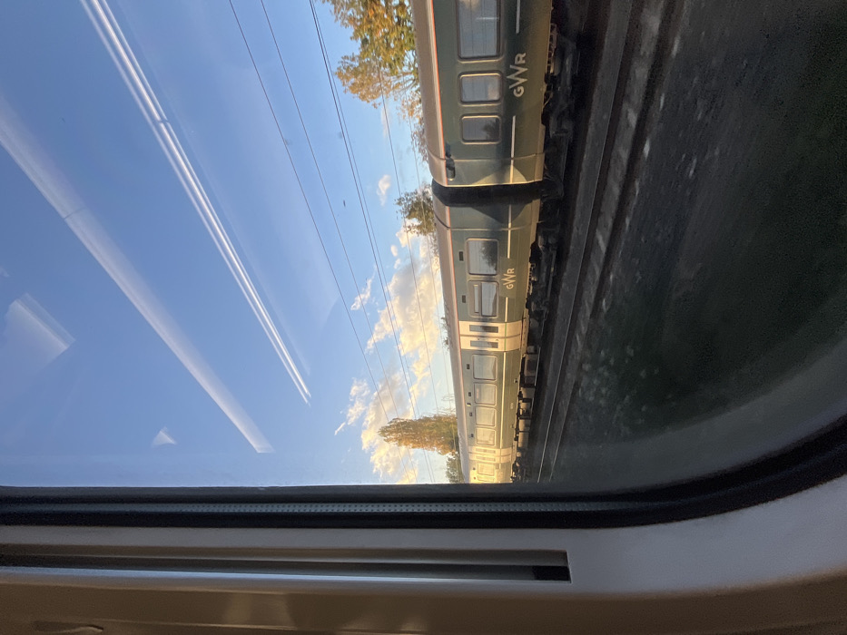 - "The image captures a dark green Great Western Railway (GWR) passenger train moving on a multi-track railway line, viewed from the window of another train" by FM-Gy0vP2, licensed under CC BY 4.0