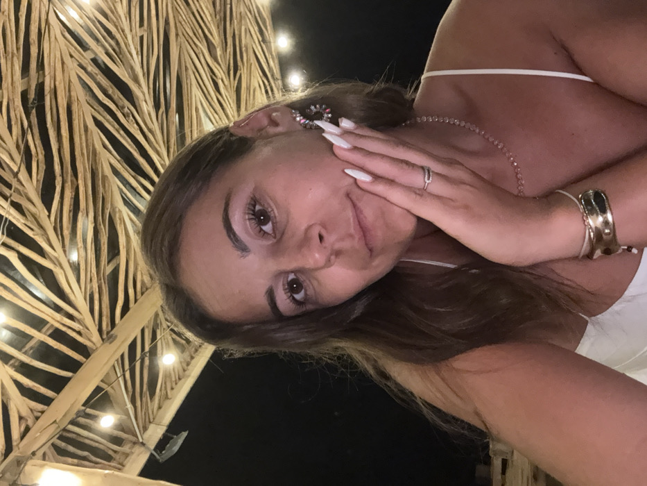 An indoor nighttime portrait captures a female individual in Ahangama, Sri Lanka. The subject, a young adult with long brown hair, is positioned centrally, looking directly at the camera with a subtle smile. She is wearing a white, thin-strapped top. Her left hand is raised, with fingers resting against her chin and cheek. This hand displays long, white, pointed fingernails, a thin silver-toned ring on the ring finger, and a wide gold-toned cuff bracelet on the wrist, accompanied by a thinner light-colored cord bracelet. A large, multi-gemmed, circular earring is visible on her right ear, and a delicate, light-colored beaded necklace is worn around her neck. The background reveals a rustic ceiling constructed from numerous light-colored wooden planks or branches arranged in a radial pattern, illuminated by multiple string lights, indicating a dimly lit environment. A wooden support beam is partially visible on the far left.