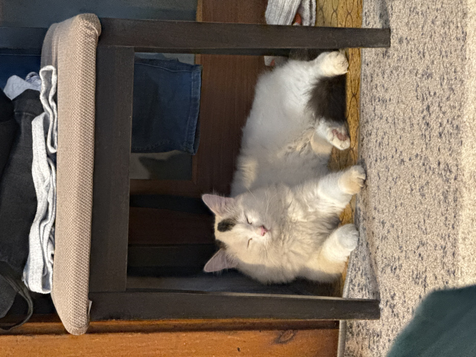 - "An indoor scene in Nova Zagora, Bulgaria, depicts a long-haired cat resting on a patterned hard floor surface beneath a dark-framed, light-beige upholstered stool" by FM-QrpvK2, licensed under CC BY 4.0