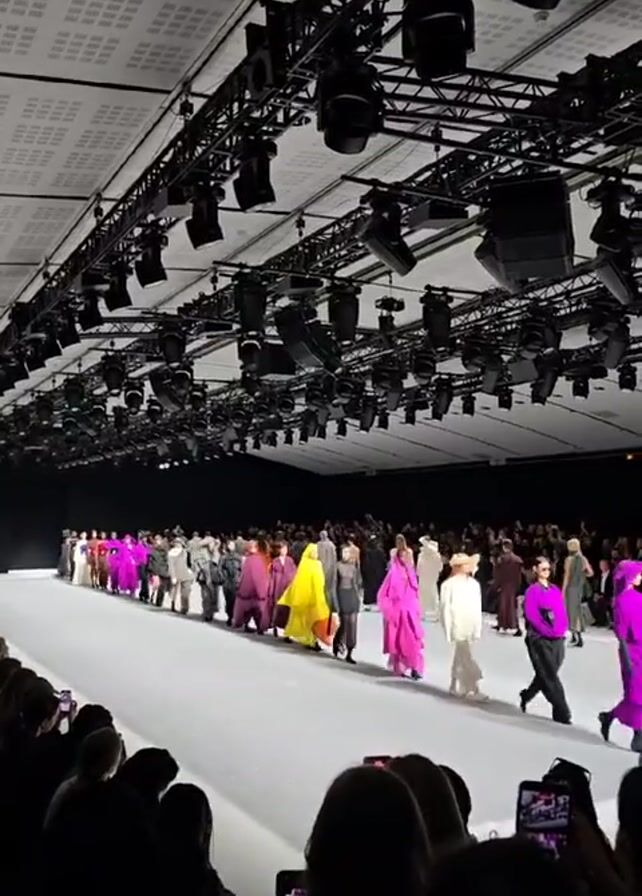 The video captures a fashion show. A long runway stretches through a large, well-lit hall, packed with rows of seated spectators. Overhead, a complex network of lights and sound equipment hangs from the ceiling. Models in a diverse array of colorful outfits, ranging from bright pink to yellow, are walking down the runway in a line. Many people in the audience are holding up their phones, recording the event.