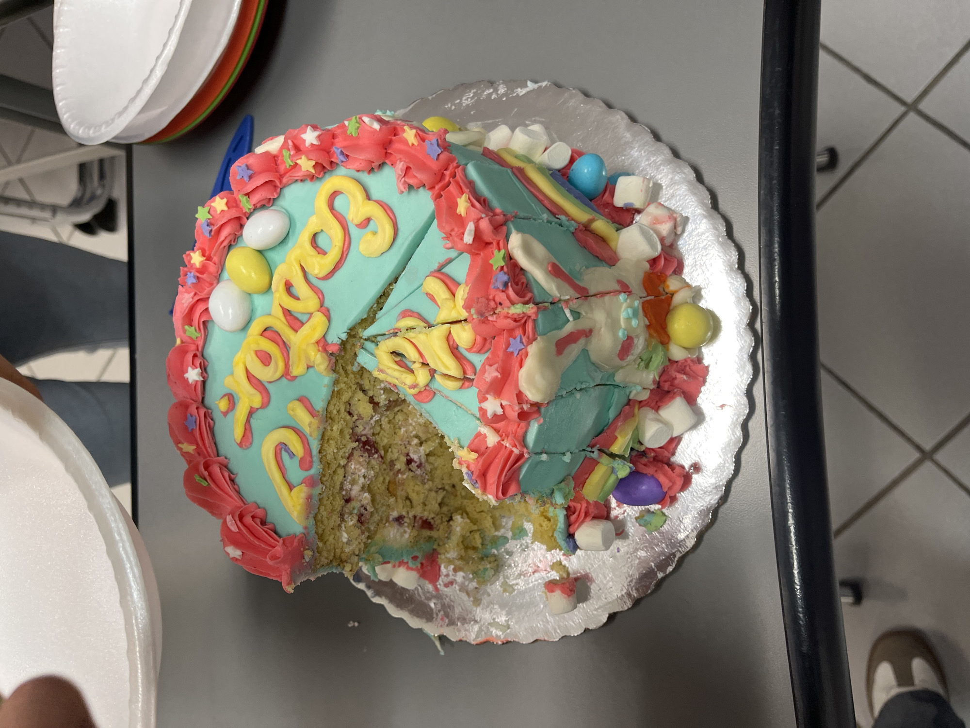The image presents a partially consumed round cake situated on a silver foil-covered cardboard base, resting on a gray tabletop. The cake features teal blue icing on top, accented with pink piping along the perimeter and yellow cursive text that partially displays "2023." Decorative elements on the cake's surface include white and yellow egg-shaped candies and small colorful star sprinkles. The sides of the cake are adorned with vertical colorful strips, small white cylindrical marshmallows, various colored candies (purple, blue, yellow, green, orange), and a white bunny motif. Multiple slices have been removed, revealing the cake's interior, which consists of a light-colored sponge cake layered with white cream and red fruit filling. Crumbs and scattered marshmallow pieces are visible on the silver base. A hand is visible in the upper left of the frame, holding a white foam plate above the cake. To the upper right, a stack of white disposable bowls with red, orange, and green rims is present. In the background, a person wearing a blue garment is partially visible. The lower portion of the image shows a black metal bar, likely part of furniture, and a tiled floor. A person's lower leg and a brown and white shoe are discernible in the bottom left. The precise location within the city of Puebla, Mexico, cannot be determined from the visual evidence in the image.