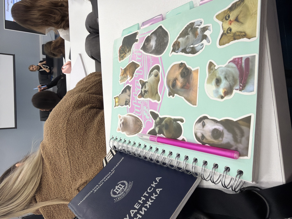 The image depicts an indoor scene in a lecture hall or classroom at the National Sports Academy "Vasil Levski" in Sofia, Bulgaria. In the immediate foreground, positioned on a white tabletop, a light-blue, spiral-bound notebook is open, its cover extensively adorned with various meme-style stickers featuring cats and dogs. A pink gel pen rests diagonally across the notebook. To the left of the notebook, a dark blue "Student's Book" (Студентска книжка) from the aforementioned academy is partially visible. In the midground, the back of a person with blonde hair, wearing a brown textured jacket, is visible, seated at the same table, facing away from the camera. Other individuals are seated further back at tables, facing a speaker. In the background, a female speaker with light hair, dressed in a dark top, addresses the room from behind a table where a laptop is present. Behind her, a large white projection screen is mounted on a light-colored wall. To the right of the screen, Cyrillic text, including "Поощрение," is visible on another display. The environment suggests an academic or seminar setting.