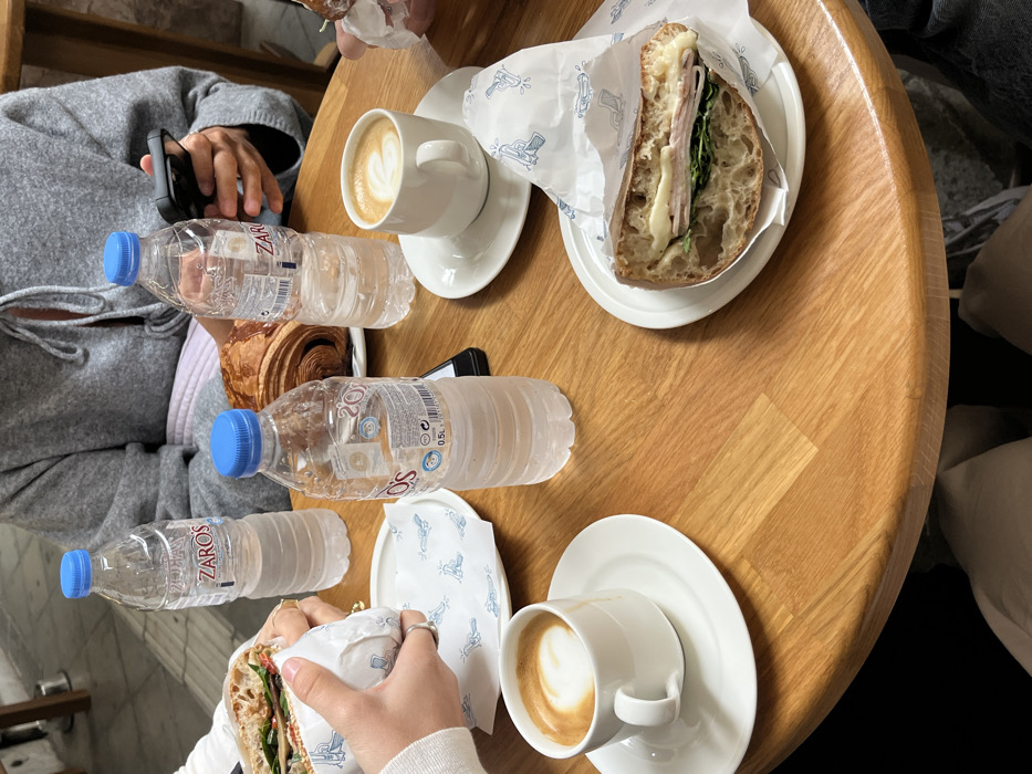 A close-up, elevated view captures a casual meal shared by at least three individuals at a round, light-wood table, likely within a cafe in Athens, Greece. Three 0.5-liter Zaros brand plastic water bottles with blue caps are distributed on the table, two of which show condensation. Two white ceramic cups containing cappuccino with heart-shaped latte art rest on white saucers. Three sandwiches, prepared with ciabatta-style bread, are visible: one is held by hands with a ring on the left index finger, partially wrapped in white paper with blue illustrations; another, also wrapped in similar paper, rests on a white plate and reveals layers of ham, cheese, and arugula; and a third sandwich is partially visible on the far left. A partially consumed croissant is situated on a white plate, and a person wearing a grey hooded top with a drawstring collar is holding a black mobile phone in their right hand. The background is blurred, showing a light-colored floor and wall.