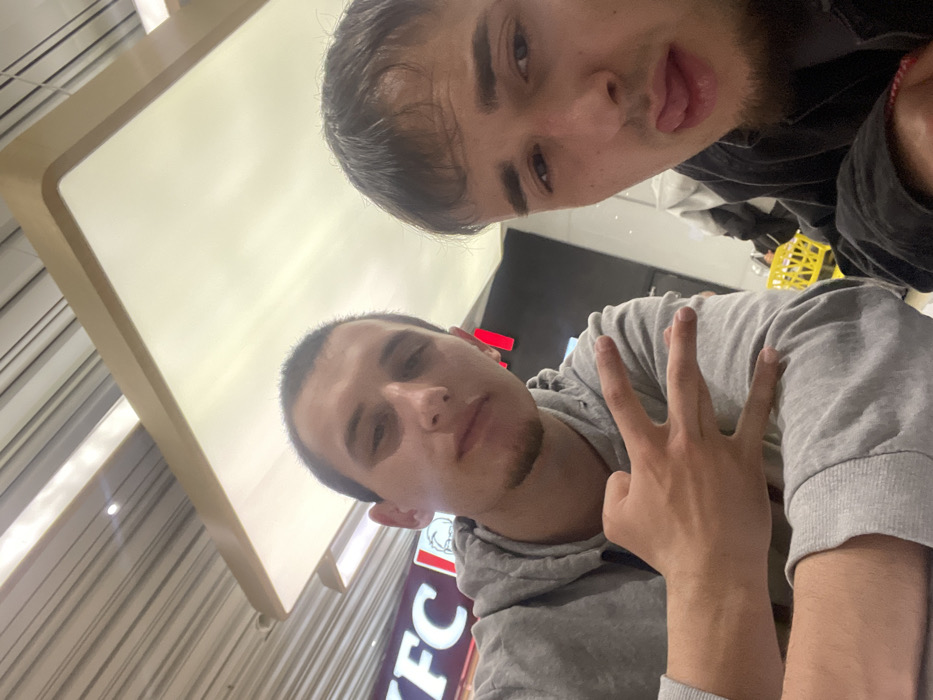 Two young males are captured in a close-up, upward-angled selfie within a KFC restaurant in Plovdiv, likely located in a shopping mall or food court