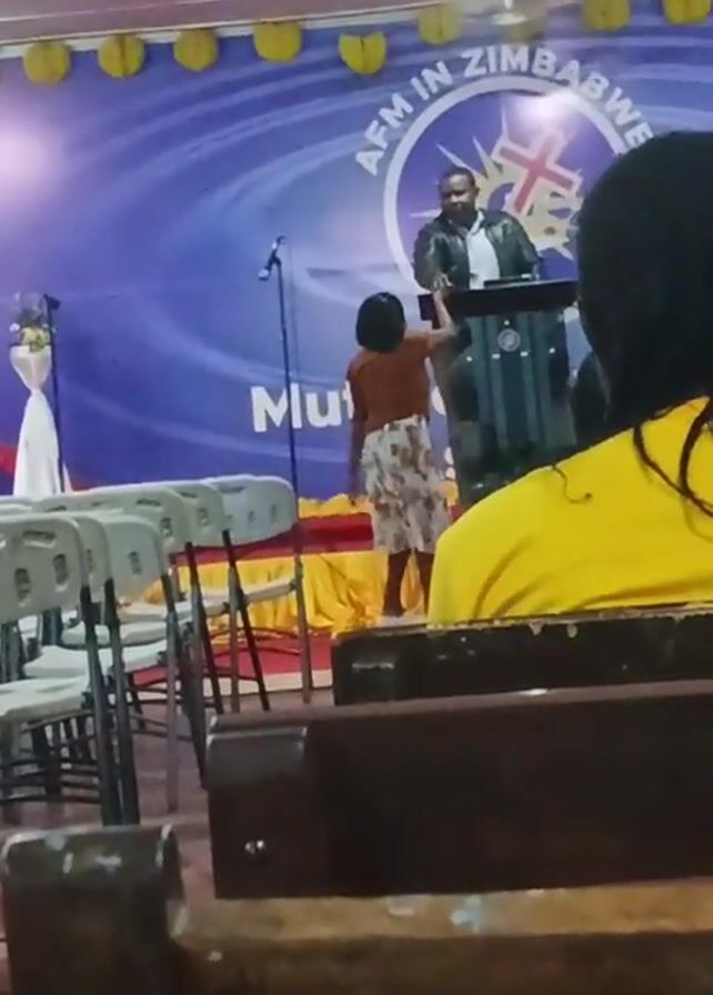 interior of what appears to be a church. A man is speaking from a podium on a stage, with a banner behind him that reads "AFM IN ZIMBABWE". A woman in a brown shirt and floral skirt is standing in front of the stage, gesturing with her hands. There are empty chairs in the foreground and a person wearing a yellow shirt is visible in the lower right corner of the frame. The lighting is bright.