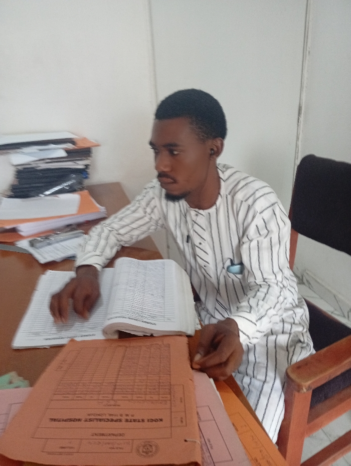 The image captures a young adult male seated at a wooden desk within an administrative area of Kogi State Specialist Hospital, located in Kogi State, Nigeria
