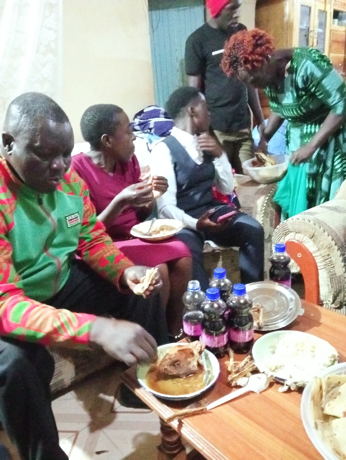 A group of people are gathered indoors around a small wooden table laden with food and bottled drinks. Individuals are seated and appear to be eating, with some holding plates and food items. A woman in a patterned green dress is serving from a large bowl. A man in a black shirt and red hat stands behind her. The room is dimly lit, with a door visible in the background. The food consists of what appears to be meat, flatbreads, and a rice-like dish.