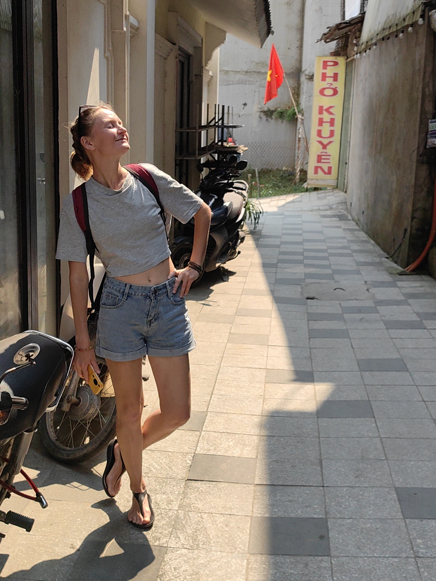 The image captures a sunlit alleyway or narrow sidewalk in Sa Pa, Vietnam. A young adult female stands in the mid-foreground, facing right, with her head tilted back, eyes closed, and a slight smile, seemingly enjoying the bright sunlight. She has light-colored hair pulled back, sunglasses perched on her head, and wears a grey cropped t-shirt, light blue denim shorts, and black flip-flops. A dark red backpack is on her shoulders. Her left hand holds a yellow-cased smartphone and rests near her left hip, while her right hand is on her right hip. Her legs are crossed at the ankles, with her left knee slightly bent. To the immediate left of the woman, the seat and front wheel of a black motorcycle are partially visible. Further down the alley on the left, several other motorcycles are parked, partially obscured by shadows. On the right side of the alley, a plain, light-colored wall runs parallel to the pavement. A vertical yellow sign with red Vietnamese lettering, reading "PHỞ KHUYÊN," is affixed to this wall beyond the woman. Above the sign, a red Vietnamese flag with a yellow star is displayed on a pole. The ground is paved with rectangular tiles in alternating shades of grey, forming a checkerboard pattern. Strong sunlight from the left casts prominent shadows of the woman and parked motorcycles onto the tiled ground.