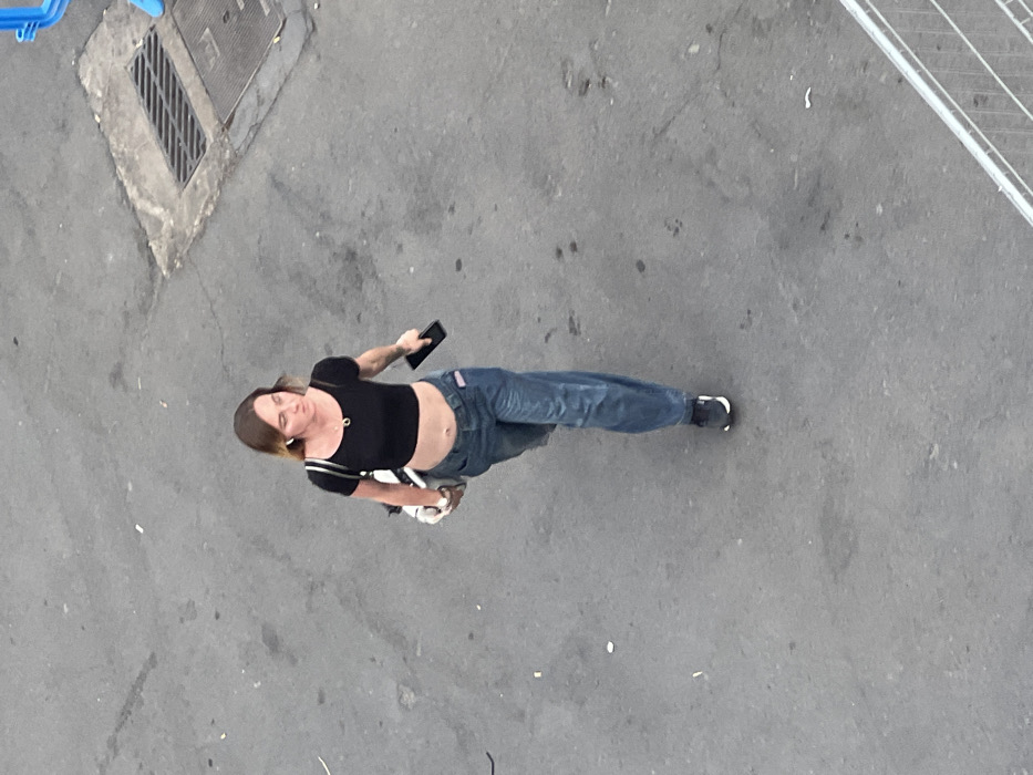 - "An overhead view captures a single female subject walking on a grey paved surface in Playa Del Inglés, Spain" by FM-33L543, licensed under CC BY 4.0