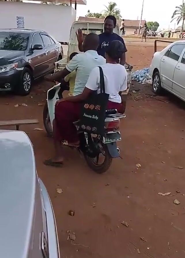 scene in an outdoor parking lot. A man is seated on a white moped with two passengers: a child sitting in front and a woman sitting behind him. A black tote bag hangs from the back of the moped seat. Another man stands behind the moped, facing the passengers, seemingly talking to them. A fourth man walks into the frame from the right, crossing in front of the group. The parking lot is unpaved, with a reddish-brown dirt surface. Several cars are parked in the background, including a grey sedan, a white pickup truck, and a white sedan. A low wooden bench sits in front of the moped. A building with a red awning is visible in the background. The weather appears to be sunny.