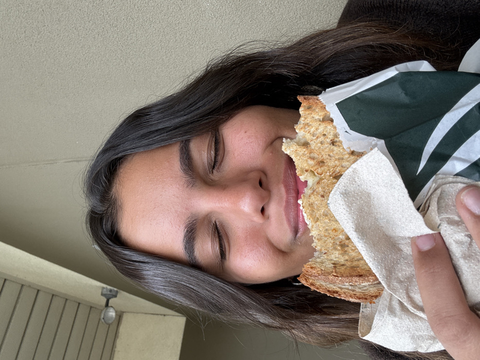 A medium close-up image shows an individual with dark hair and olive skin, eyes closed and smiling, indicating satisfaction while eating a sandwich. The partially consumed sandwich features toasted multi-grain bread with a visible white filling and is wrapped in a light brown paper napkin overlaid with green and white patterned paper, consistent with Starbucks branding. The person's hand is visible holding the sandwich. The background consists of a plain, light-colored, textured wall. In the upper left quadrant, a white soffit structure with an attached metallic light fixture is discernible. The scene is located in the city of West Windsor, United States.