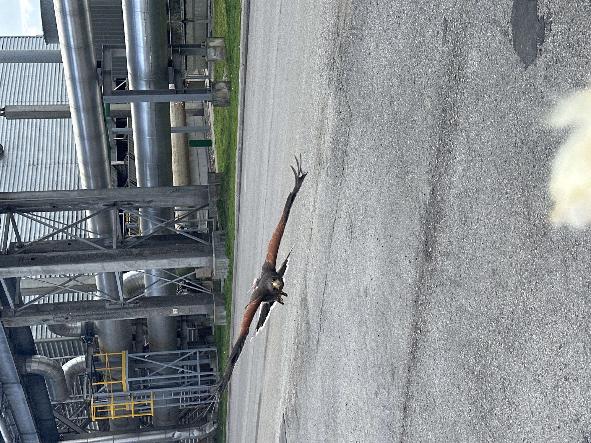 A Harris's Hawk (Parabuteo unicinctus) is depicted in mid-flight, wings broadly extended, with its body angled towards the ground. The bird exhibits dark brown plumage, distinct rufous-brown shoulders, and visible white feathering at the base of its tail. Its head is turned, presenting a direct view of its dark eyes and yellow cere, and a small, dark object consistent with a tracking device is visible on its back between the wings. Its talons are extended forward, poised for action. The hawk hovers just above a grey asphalt surface that shows minor wear and scattered small stones. Behind a concrete curb, a strip of green grass separates the foreground from a large industrial complex. The background features a network of substantial silver-colored pipes, some insulated, running horizontally and vertically, supported by grey metal structures and concrete columns. Elements such as a yellow metal ladder platform, corrugated metal building facades, and additional structural components are visible. The scene is situated within an industrial zone in Razgrad, Bulgaria.
