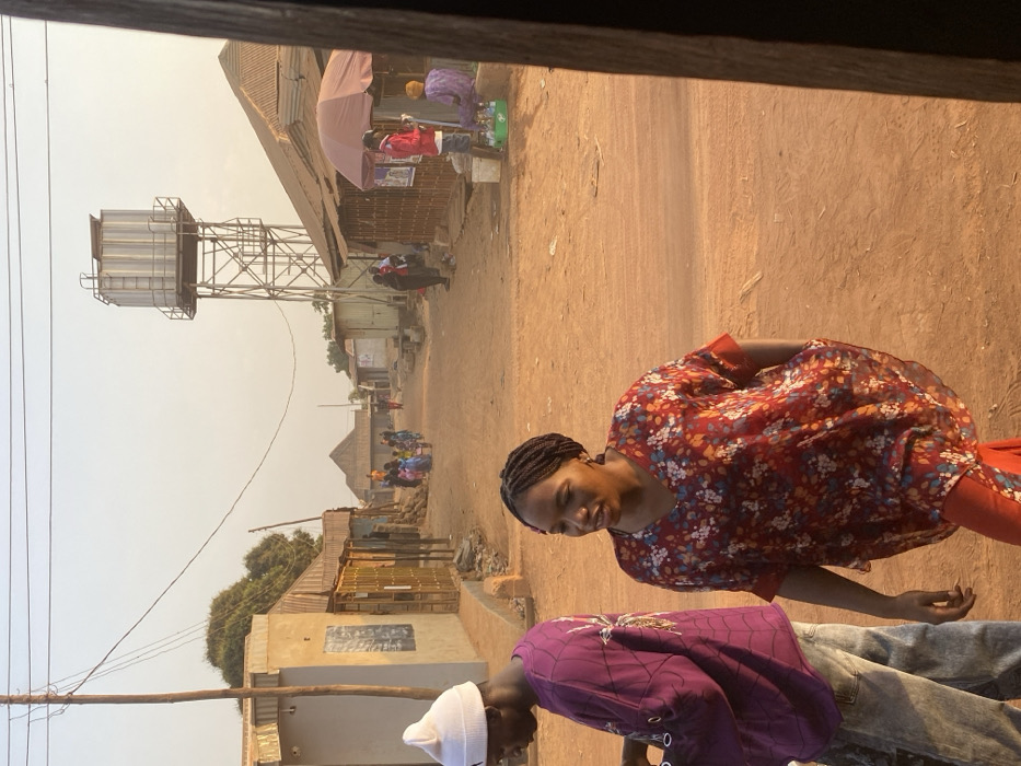 A dirt road runs through a dusty village, showcasing simple buildings with corrugated metal roofs. A water tower stands prominently. In the foreground, a woman in a floral-patterned top and red pants is partially visible. Beside her is a man wearing a purple shirt, jeans, and a white beanie, bowing down. The perspective is from an elevated viewpoint, likely inside a vehicle or building. The overall scene conveys a sense of everyday life in a modest community.