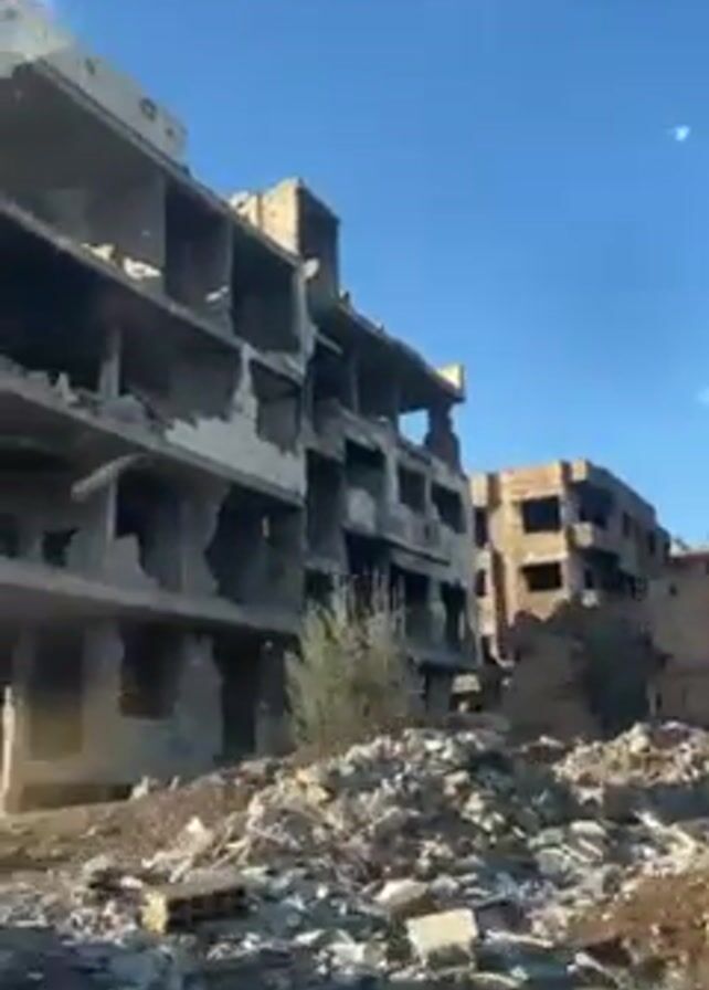 scene of devastation, likely in a war-torn area. The camera, apparently inside a moving vehicle, passes by several buildings that are heavily damaged, with walls blown out and debris scattered everywhere. The buildings are multi-story and appear to be residential. The sky is clear and blue. The landscape is mostly barren with some sparse vegetation. A concrete barrier is visible along the road. The overall impression is one of destruction and ruin.
