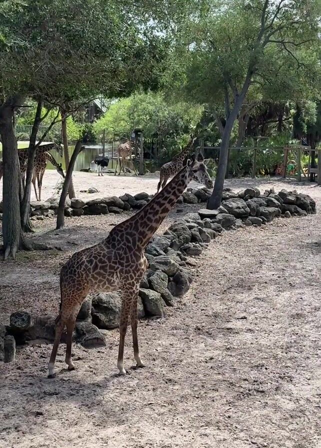 The scene is an outdoor zoo enclosure, featuring a dirt ground, rocks, trees, and a pond in the background. Several giraffes are present, including one prominently in the foreground. A child's voice is heard, questioning why the giraffe's tongue is purple. The camera zooms in on the head of the giraffe, showcasing its facial features.