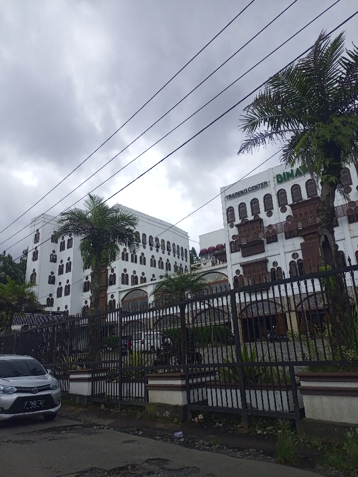 Two white buildings behind a black metal fence dominate the view. The building on the right has "TRAINING CENTER" and "DINAH" signs atop arched windows and ornate brown balconies. The left building mirrors the architectural style, but lacks signage. Tall palm trees stand between the buildings and fence. A silver car parks beside the fence on the left. Overhead, thick power lines cross a cloudy sky. The foreground is a paved street with some minor damage.