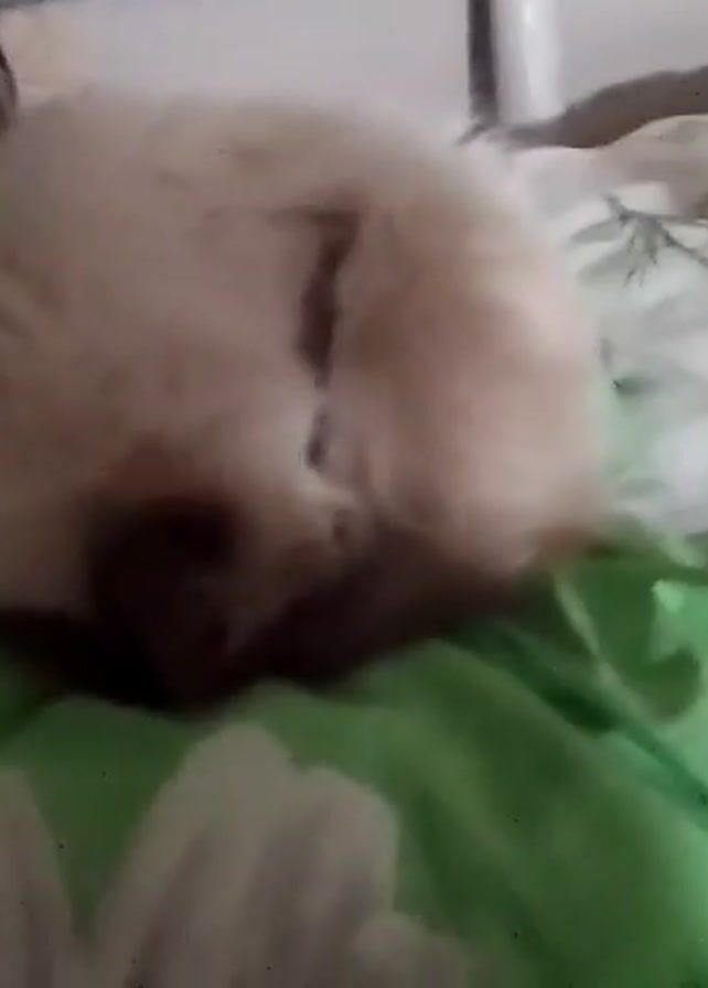 A light-furred dog is curled up on a green pillow. A hand pets the dog. The pillow is on a bed with patterned sheets. A wire frame is partially visible in the background.