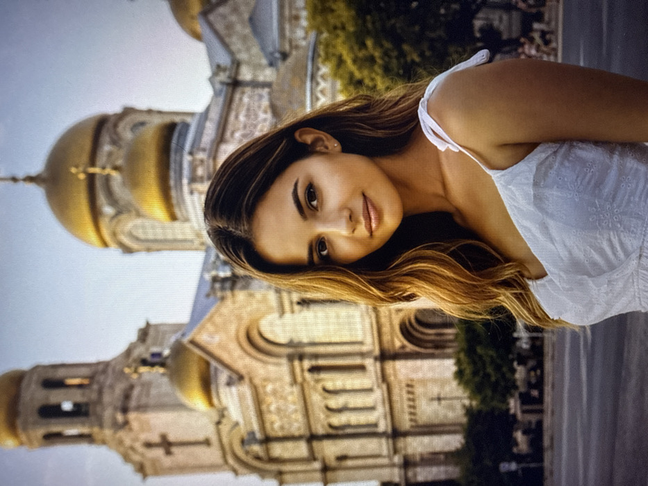 A young adult female is positioned in the foreground, facing the camera with a slight smile. Her hair is long, wavy, and dark brown with lighter highlights, parted on the side. She wears a white sleeveless dress featuring thin shoulder straps and embroidered details on the bodice. A small stud earring is visible in her right ear. The background is dominated by the Saint Alexander Nevsky Cathedral in Sofia, Bulgaria. The cathedral's distinct light-colored stone facade, multiple large golden domes, and associated Orthodox crosses are clearly visible. Architectural details include arched windows and decorative stone elements. The scene is illuminated by natural daylight, suggesting an outdoor urban environment. A paved surface, consistent with a street or plaza, is discernible in the lower midground. Blurred green foliage from trees is present to the left of the subject, and indistinct human figures are visible in the far background on the right, suggesting public activity.