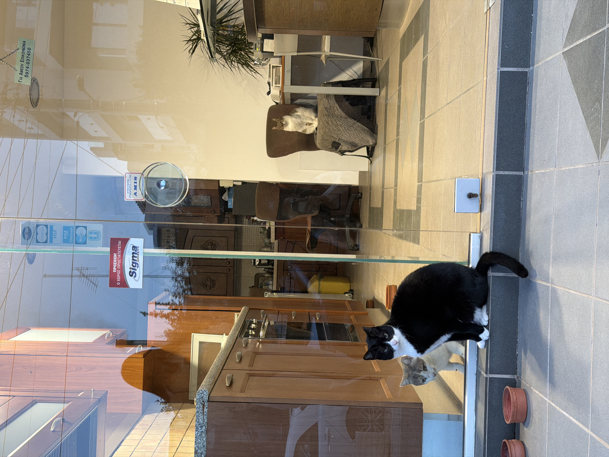 This image captures an exterior view looking into an establishment through a large glass door, located in the Municipal Unit of Elliniko, Greece. **Exterior:** A black and white tuxedo cat with green eyes sits prominently on a dark gray tiled threshold directly outside the glass door, facing forward. Its tail curls to its right. Two empty, terracotta-colored shallow bowls rest on the dark gray tiled ground to the cat's left. The exterior ground features square dark gray tiles with lighter gray diamond patterns. A metal lock mechanism is visible on the lower right portion of the glass door. **Interior (visible through glass):** A light gray/cream cat is seated directly behind the black and white cat, inside the establishment, looking towards the viewer. Further inside, on the right, a white and brown tabby cat is perched upright on a brown fabric-covered chair draped with a gray blanket, facing the glass. The interior appears to be a combined kitchen and office space. The left side reveals wooden cabinetry, a built-in oven, and a light-colored countertop. Reflections on this glass panel include a white car and a television antenna. The right side features a white wall, a desk with a plant, papers, and an office chair. A green rectangular sign with Greek text "ΓΙΑ ΑΜΕΣΗ ΕΠΙΚΟΙΝΩΝΙΑ 6974-037450" (FOR IMMEDIATE CONTACT) hangs from the ceiling on the right side. The interior floor consists of light beige square tiles with darker diagonal patterns. **Glass details:** Multiple signs and reflections are present on the glass. A red rectangular sticker with white Greek text "ΠΡΟΣΟΧΗ! Ο ΧΩΡΟΣ ΠΡΟΣΤΑΤΕΥΕΤΑΙ" (CAUTION! THE AREA IS PROTECTED) and a "Sigma Security" logo is visible on the left glass panel. Credit card logos (Visa, Electron, Maestro, Mastercard) are also visible, either as stickers or reflections, on the upper left portion of the glass. A round glass handle is on the center-left.