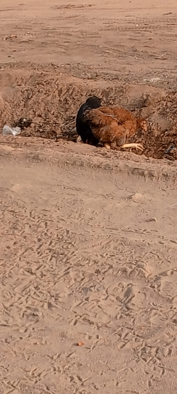 A brown and black hen sits nestled in the dirt. The hen is situated on a raised dirt mound, with a plastic bag lying to the left. The rest of the image is filled with a sandy ground, covered in various textures and small tracks. The scene is captured in daylight, casting a natural light on the hen and its surroundings.