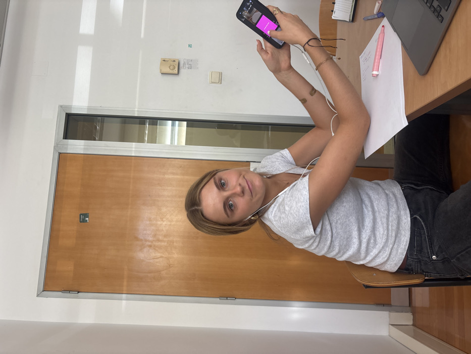 - "The scene depicts a young adult female seated at a light brown wooden table within an indoor room, possibly an office or study area" by FM-YQRt52, licensed under CC BY 4.0
