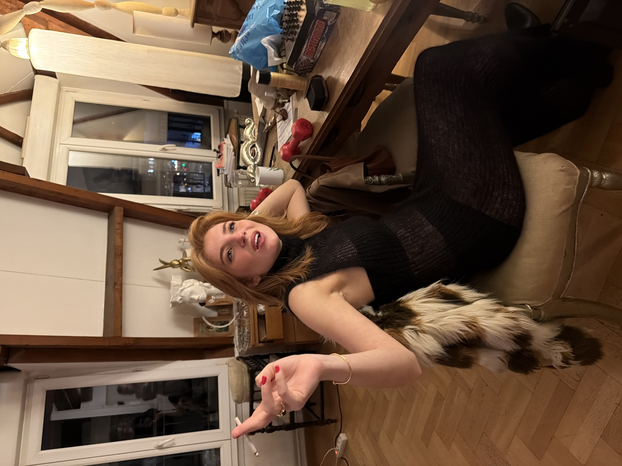 A woman with red hair is reclining in a chair in a room with an eclectic decor. She is wearing a dark, see-through dress and has a fur stole draped over the back of the chair. She is gesturing with her right hand while holding a cigarette. A table next to her holds a variety of items, including a box of Mastermind, dumbbells, and various other objects. The room has wooden beams, a window overlooking a city scene, and a general ambiance of a cluttered but comfortable living space. The location is likely Paris, France, based on the architectural style and the window view.
