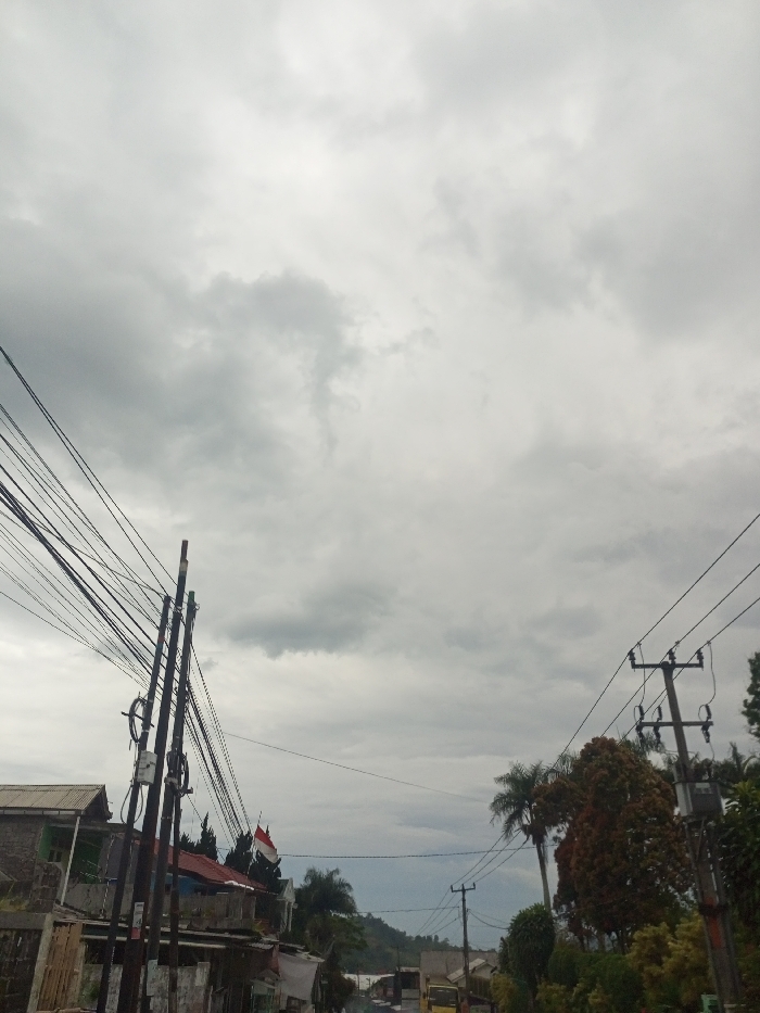 A cloudy sky dominates the view, casting a soft, gray light over a street scene. Power lines crisscross overhead, converging towards utility poles. Buildings line the left side of the frame, and vegetation frames the right. An Indonesian flag waves in the distance, and a hint of mountains adds depth to the background. A yellow truck is visible in the distance.