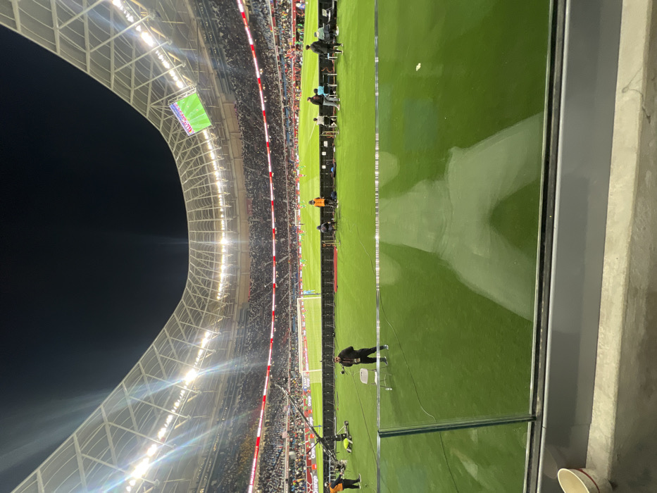 A sideways view captures a bustling soccer stadium. A curved, illuminated structure defines the stadium's edge. The stadium is packed with spectators, visible along the sidelines. A green field stretches out, reflecting light. Several figures and camera equipment are situated near the field's edge. A reflective barrier is in the foreground, along with a discarded cup.