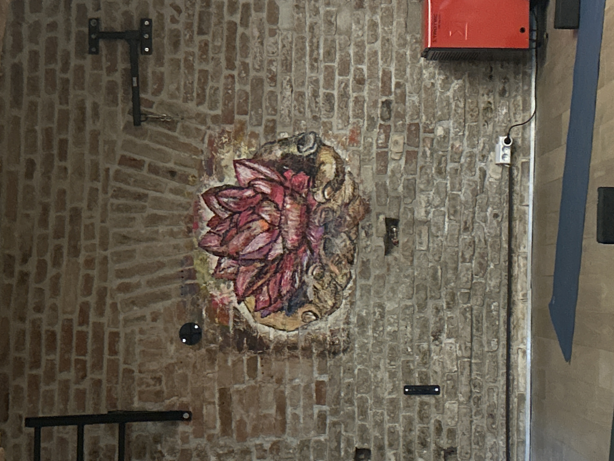 A section of a brick wall is visible, likely indoors, showing an art piece depicting a pink flower, possibly a peony or dahlia, painted on what appears to be a square of canvas or similar material. The painting is centered, slightly above the midpoint of the image. Various mounting and electrical hardware are visible on the wall, including a black metal bracket on the upper left, a red electrical box on the upper right, an outlet with a wire, and other minor mounting components. The lighting is ambient and flat. The location is Vienna, Austria.