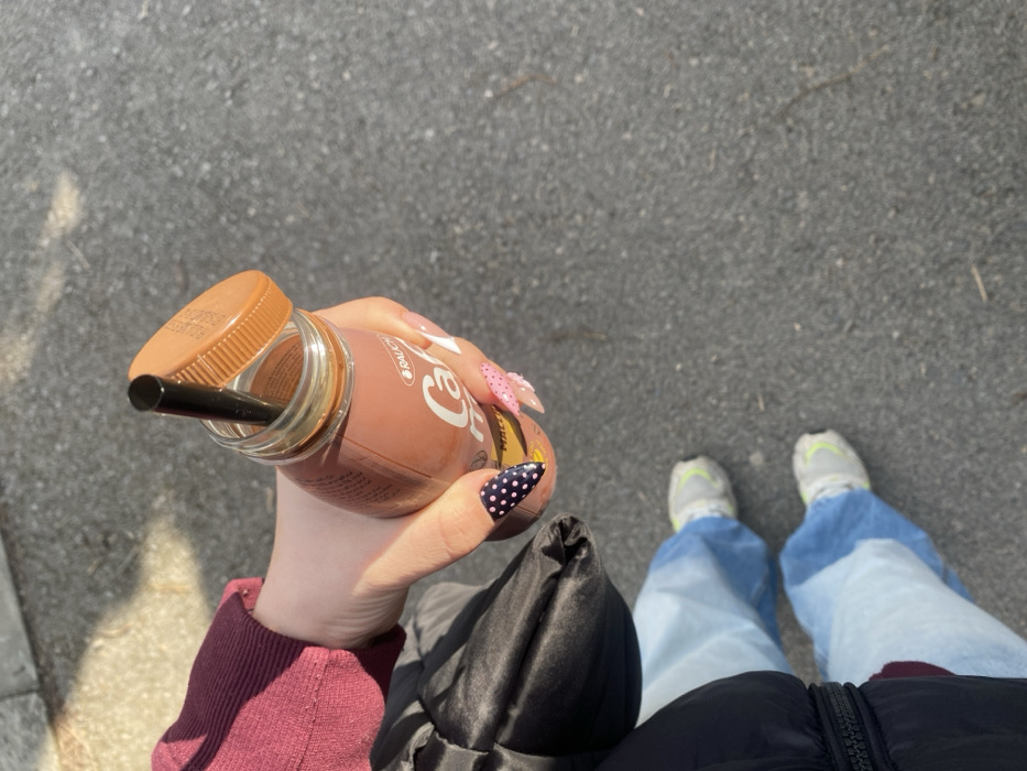 An individual is depicted standing outdoors on a grey asphalt surface in Gabrovo, Bulgaria. The subject's left hand, with manicured nails displaying black and white polka dot patterns on the thumbnail and pink polka dots or embellishments on other visible fingers, holds a clear glass bottle. The bottle contains a brown liquid, identifiable as "RAUCH Caffé" from its label, and has an orange plastic screw-cap partially unscrewed and tilted. A black straw is inserted into the bottle's opening. The subject wears a maroon long-sleeved garment, a dark, possibly black, outer jacket or coat, light blue loose-fitting trousers, and light-colored athletic shoes with neon yellow accents on the soles. The scene is illuminated by direct sunlight, casting visible shadows.