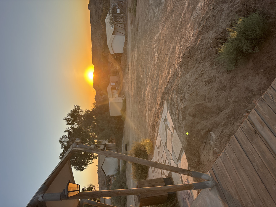 The image captures a sunset scene in an arid environment, identified as the Merhavim Regional Council, Israel. In the immediate foreground on the left, a wooden deck extends partially into the frame, supported by angled wooden posts. An overhead canopy with an illuminated antique-style lantern is visible above. Adjacent to the deck, irregular stone pavers lead to an expanse of dry, uneven dirt ground. A small, dark-colored post or bin stands near the pavers. The midground features several structures scattered across the dirt terrain: two white, canvas-like tent structures, one on the left and another on the right, with a light-colored, square building situated between them. The rightmost tent has a fenced enclosure next to it. Sparse, green desert vegetation and trees are present across the landscape. The background consists of low hills or mountains, silhouetted against a vibrant orange-yellow sky where the sun is visibly setting on the horizon, casting a strong glare and warm light across the entire scene. The sky transitions to a lighter blue towards the top of the frame. No people or animals are visible, and no discernible actions or interactions are occurring.