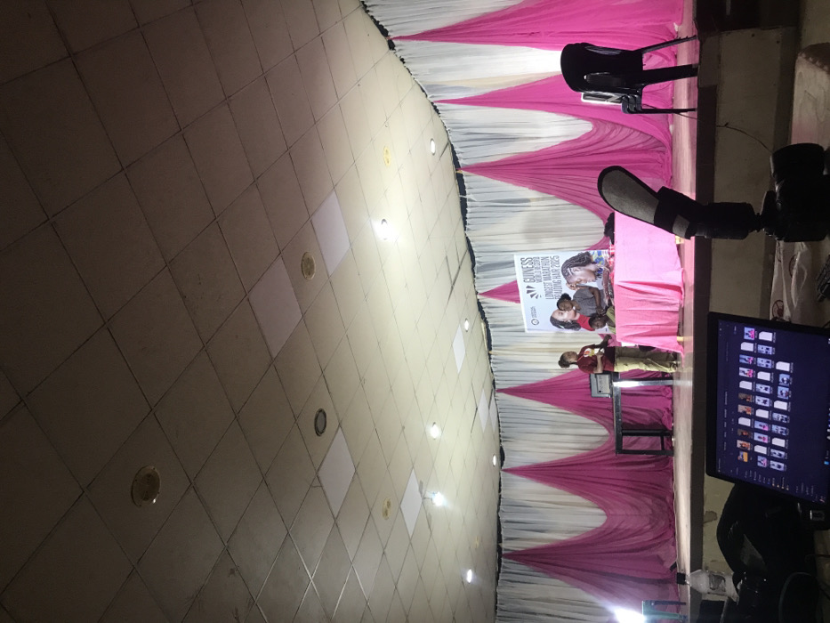 A low-angle shot of a room, possibly an event space, showcases a stage decorated with pink and white draping. A banner for a Guinness World Record attempt is visible on stage. A monitor to the right displays thumbnails, likely for a video feed. A microphone and camera setup are partially visible. The room's ceiling features square tiles with recessed lighting. A person is standing on the stage, seemingly setting up or participating in the event.