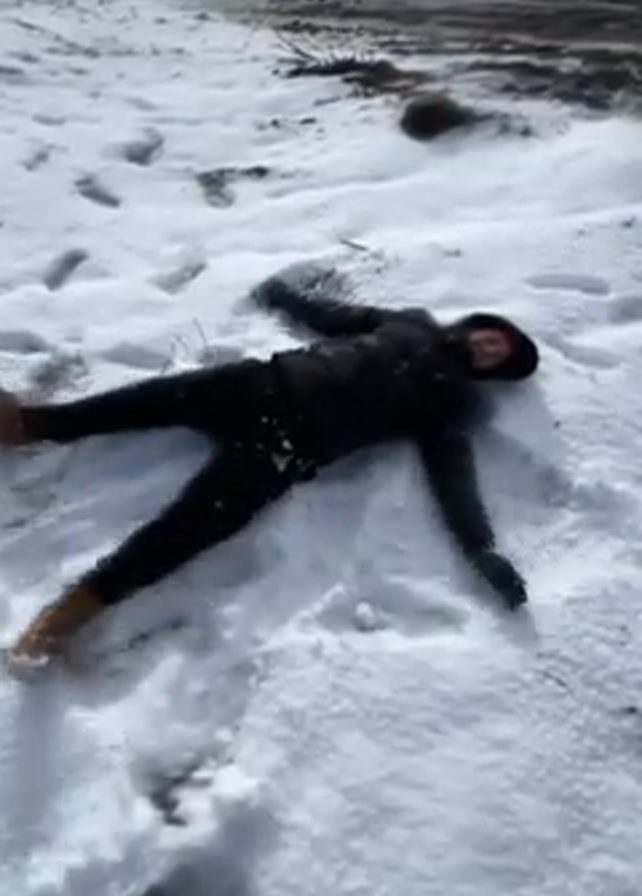 person lying on their back in a snow-covered landscape, making a snow angel. The person is wearing dark clothing, including a jacket, pants, gloves, and a hat. They are also wearing brown boots. The person is lying with their arms and legs outstretched. The ground is covered in white snow with footprints. In the background, there are some dark objects that appear to be logs. The sky is overcast. The person appears to be smiling. The video appears to have been taken from a slightly elevated angle.