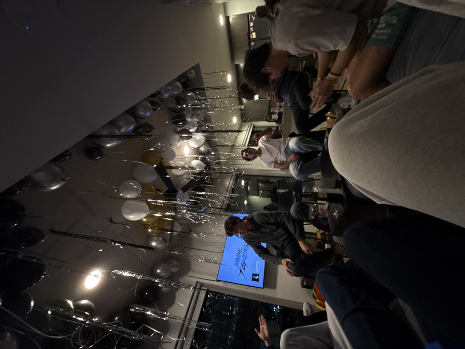 A group of people are gathered in a room decorated with balloons. A TV displays a presentation. The scene is casual, with people seated and seemingly engaged in conversation or watching the screen. The lighting is soft, creating a relaxed ambiance. The image is captured from a slightly high angle.