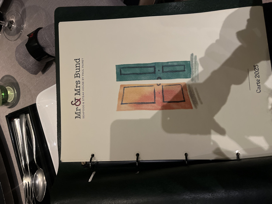 The image displays an overhead view of a dining table setting at "Mr & Mrs Bund Seafood & Steak House by Paul Pairet," a restaurant located in the Bund area of Shanghai, China. The primary subject is an open menu, held in a dark green ring-bound binder, revealing its title page. This page features the restaurant's name at the top, followed by an illustration of two simplified doors: one orange and one teal. Below the illustration, the text "Carte 2025" is visible. A prominent shadow, consistent with a hand or an overhead object, falls across the lower portion of the menu page. To the left of the menu, a black rectangular tray holds a set of polished silverware, including a fork, spoon, and knife, positioned on a white rectangular side plate. To the upper right, a grey fabric napkin is neatly folded and secured with a black napkin ring. In the blurred background, a glass containing a green liquid and a wine glass are visible, resting on a light grey tablecloth. No individuals are explicitly depicted.