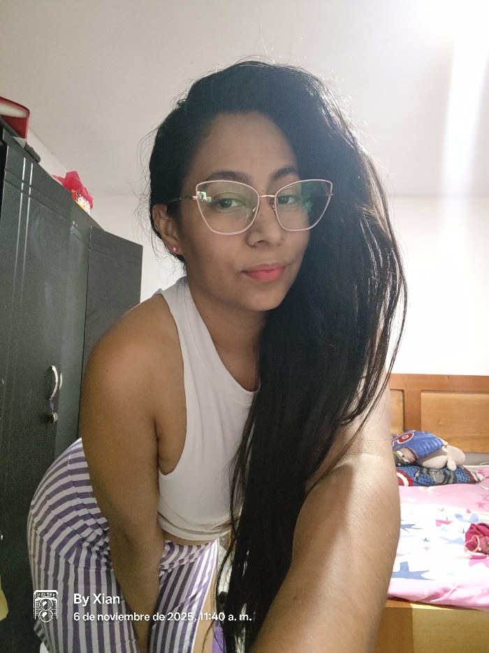 An adult female is depicted indoors, within a residential space identified as a bedroom in the city of Cali, Colombia. She is positioned slightly bent forward, angled towards the left of the frame, and looking directly at the camera with a neutral expression, indicating a selfie. She wears a white sleeveless top and purple and white striped pants. Her long, dark hair cascades over her right shoulder and extends across her chest. She wears cat-eye shaped, rose gold-colored glasses and a small pink stud earring in her left ear. Her lips are tinted with a light pink color. In the background, to the left of the subject, a dark gray or black two-door wardrobe with silver handles is visible. A red object is partially visible on top of the wardrobe. To the right of the subject, a wooden headboard is present, bordering a bed. The bed is covered with pink bedding, and a decorative pillow featuring blue and red patterns, along with a white plush toy, are visible on its surface. The room features white walls and appears to be illuminated by ambient natural light. A digital watermark in the bottom left corner displays "By Xian" and a timestamp "6 de noviembre de 2025, 11:40 a. m."