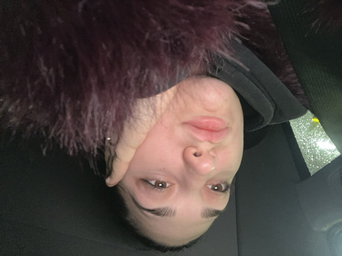 A fair-skinned person with dark eyebrows and eyes is positioned off-center in the frame, their face tilted upward. They appear to be inside a car, visible through a rain-streaked window. They are wearing a dark hoodie with a fur-trimmed collar. The person's right hand is partially visible, touching their cheek. The setting appears to be dark.