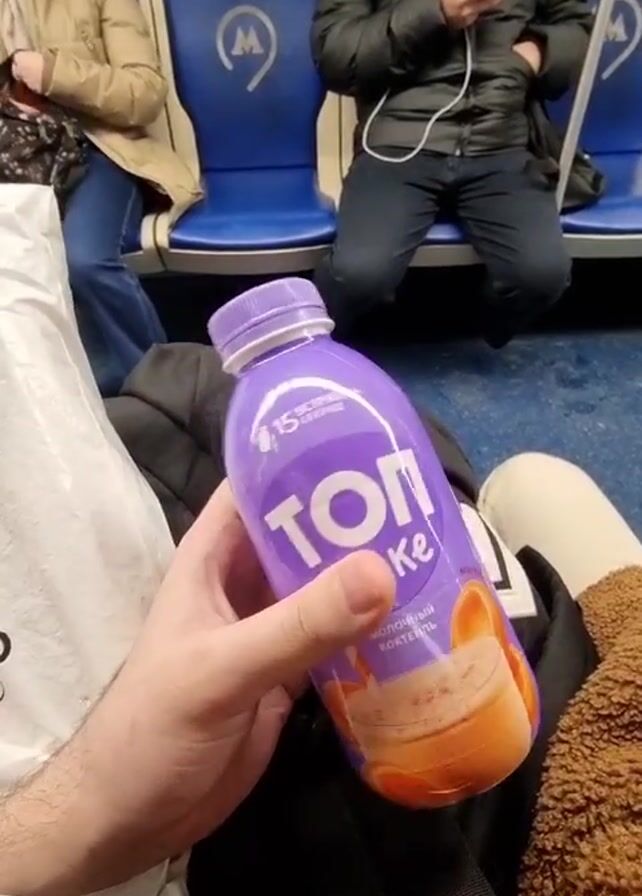 person riding the subway. The person is holding a purple bottle of Top Shake Milk Cocktail with an orange flavor. In the background, there are two other passengers sitting on blue seats. One is a woman in a beige jacket, and the other is a man in a black jacket who is looking at his phone. The subway car has white walls and blue seats with the letter "M" on them.