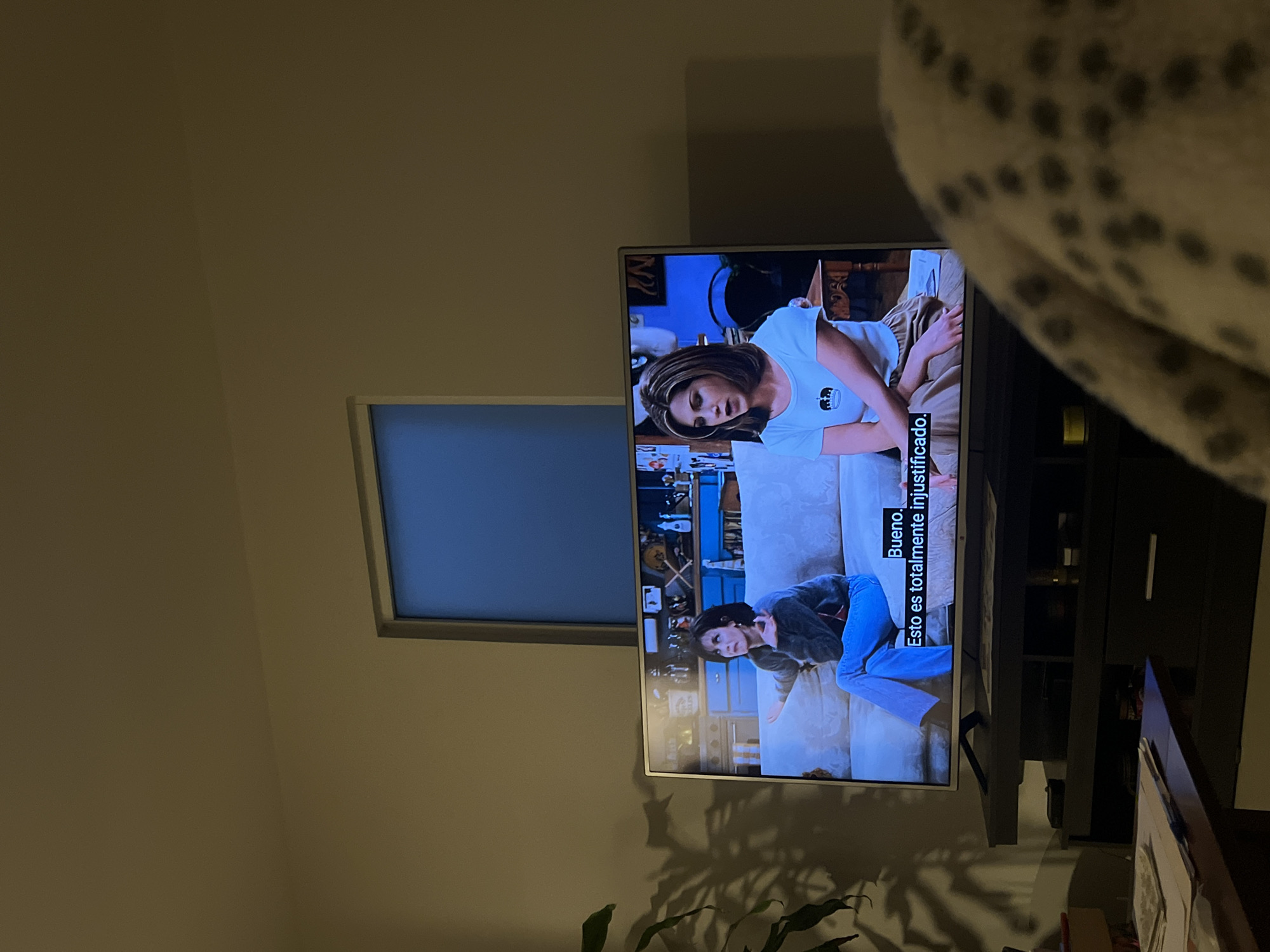 An interior scene is depicted in low light, focusing on a large flat-screen television. The television displays a scene from the American sitcom "Friends," featuring two female characters, Monica Geller and Rachel Green, seated on a light-colored sofa. Monica, on the left, wears a dark sweater and blue jeans, gesturing with her left hand. Rachel, on the right, wears a light t-shirt with a dark emblem and light-colored pants. Spanish subtitles reading "Bueno. Esto es totalmente injustificado." are present at the bottom of the screen. The television rests on a dark, multi-tiered media console with shelves and drawers; a yellow cylindrical object is visible on the console's top right shelf. Above the television, a high, rectangular, frosted or blue-tinted window is set into a plain light beige wall. To the left of the television, a dark green houseplant is partially visible, casting a significant shadow on the wall. In the lower-left foreground, a dark wooden table holds a stack of papers and a pen. The lower-right foreground is occupied by a blurred, light-colored, patterned blanket. The specific location within the city of Barrio de Nuevo León, Mexico, cannot be determined from the visual evidence provided; the scene is a domestic interior.