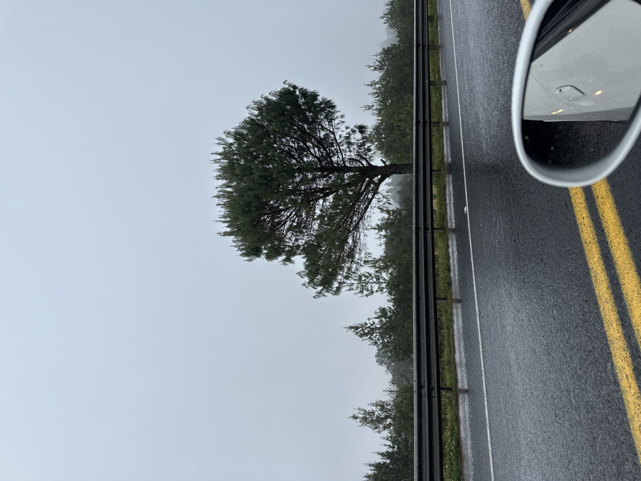 A roadside view under overcast skies shows a tree standing alongside a highway guardrail. Rain slicks the asphalt of the road, marked with double yellow lines. The side mirror of a car is visible in the upper right, offering a glimpse of the surrounding environment. The scene conveys a sense of motion and travel during inclement weather.