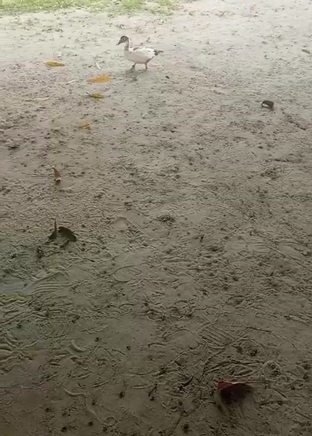 A duck is walking along a sandy area with some leaves scattered on the ground. The sandy area is bordered by grass on the left, and there are some footprints in the sand. The duck is white with some grey markings. The video is taken from a slightly elevated position, looking down at the scene.