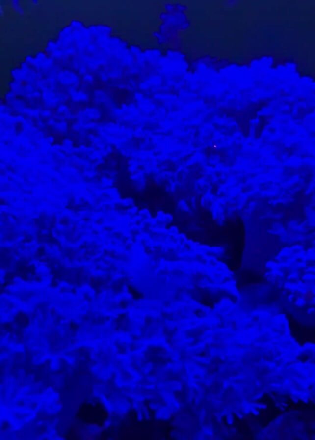 The video depicts a coral reef illuminated by intense blue light