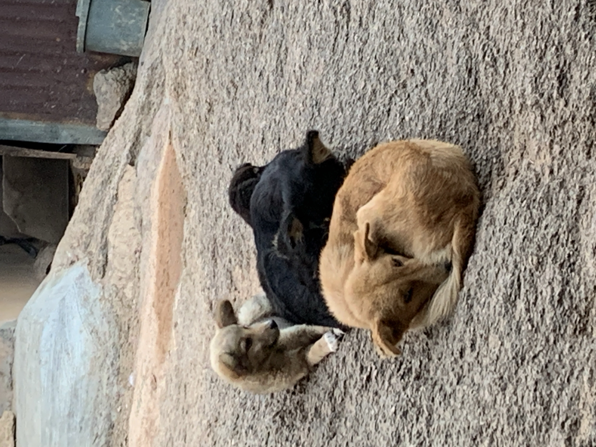 Three African wild dogs are resting on a rock surface. One dog is black, one is tan, and one is light brown. The scene is located in the city of Jos, Nigeria. The surrounding environment appears to be a rocky, outdoor area, possibly within a wildlife park or conservation area. There are some constructed elements in the background, including what appears to be a metal structure.